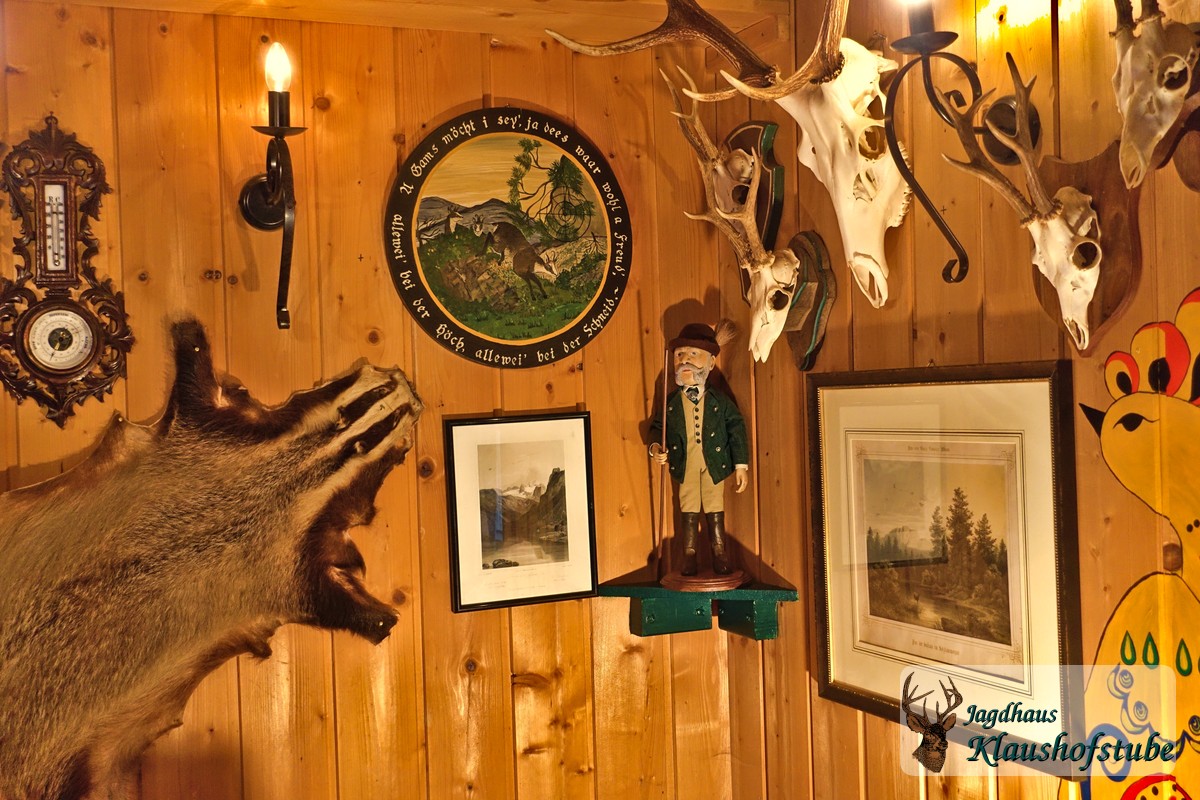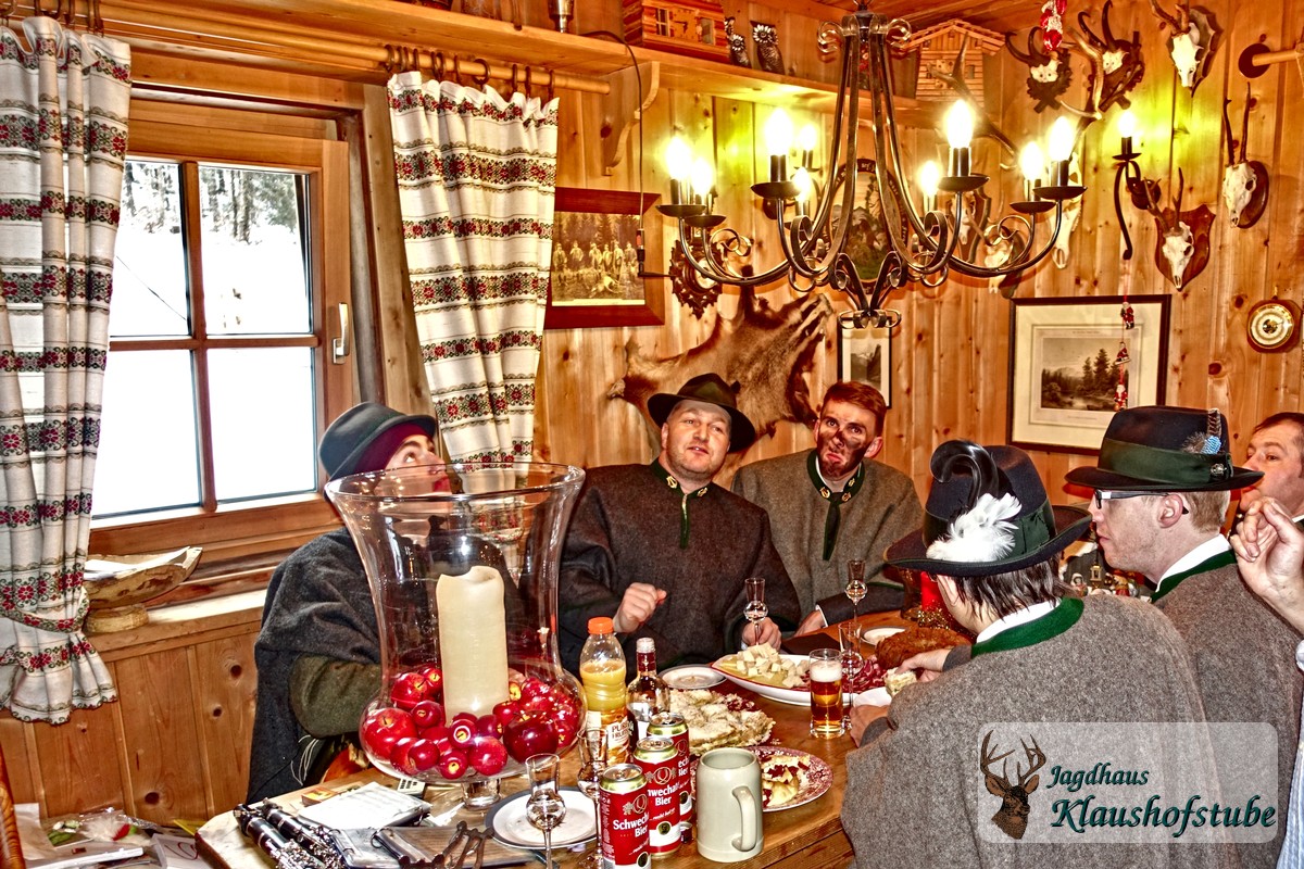 Die große alpenländische Wohnküche, die sich im - heute privaten - Erdgeschoß des Jagdhauses befindet, war einst der zentrale Dreh- und Angelpunkt des Hüttenlebens. Hier traf sich die ganze Jagdgesellschaft zum gemeinsamen Essen, und man kam zur Vorbereitung der Pirschgänge und natürlich zur Nachbesprechung des Jagdergebnisses (der "Strecke") zusammen. Der Brauch des "Tottrinkens", bei dem ein kapitaler Hirsch oder Rehbock durch reichlichen Genuß von Schnaps, Bier und Wein und dazu auch einer "Jause" (herzhafte Mahlzeit mit regionalen Spezialitäten) gewürdigt wird, ist sogar heute noch in den Bergen üblich. Einmal im Jahr, im Spätherbst, laden wir unsere Revierjäger zu diesem alten Ritual, das bei uns allerdings nur noch symbolisch begangen wird, in die historische Kaiserstube der Hütte ein. Als Gast unserer Klaushofstube bist Du herzlich willkommen, an dieser alten Tradition teilzuhaben.