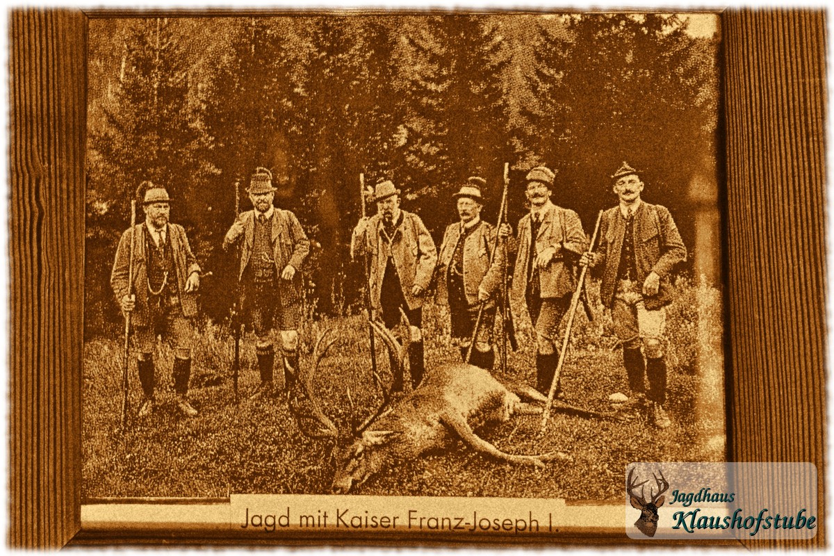 Kaiser Franz-Josef I. war ein großer Freund der Berge und der Jagd, und unzählige Jagd- und Bergausflüge in unser Gosautal sind historisch belegt, zuerst gemeinsam mit Kaiserin Sisi, später aber immer öfter im kleinsten Kreise oder gänzlich inkognito. Es ist auch überliefert, dass Franz-Josef bei seinen Jagden durchaus leutselig mit den einheimischen Jägern verkehrte. So können wir uns gut vorstellen, wie "Seine Majestät" im Jagdgewand (siehe altes Foto von 1912) mit seinen Jagdgenossen am großen Tisch in der Kaiserstube zusammensaß, genau so, wie es heute auch noch ausschaut (siehe neues Foto von 2018), wenn Jäger bei uns zu Gast sind. Der Tisch ist übrigens noch original von damals.